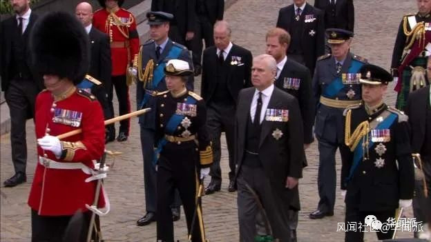步行跟在靈柩後面的是由國王率領的一眾女王親屬。除查爾斯國王外,走在第一排的分別是安妮公主、安德魯王子和愛德華王子。