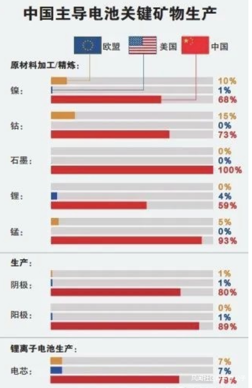 美國裝機量排名前四的電池企業,沒有一家是美國本土企業;第二,在美國市場佔有率領先的松下,在全球市場早已經潰敗…….也就是説,在中國新能源戰場不堪一擊的松下,還能在美國當霸主,由此可見美國本土電動汽車產業鏈的薄弱和落後。更重要的是——電池產業的核心技術和材料,都在中國手上。