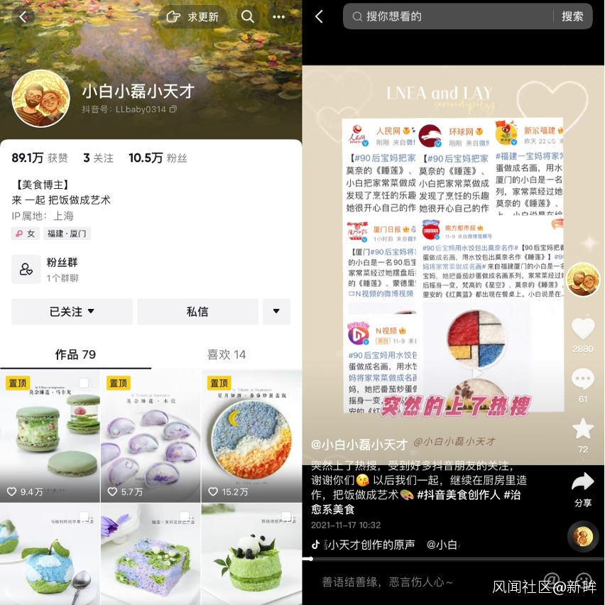 距離美食創作者@小白小磊小天才 接觸抖音圖文不到一年,如今的賬號已經積累了超過10萬的粉絲。回憶一開始,從職場女性到居家寶媽,身份的轉變加上身心的壓力,讓小白亟需找到一個情緒的出口,做輔食、米粉的時候她覺得單調無趣,但如果將山藥泥假裝成奧利奧的夾心、用白涼粉製作蛋糕,事情就變得有意思了起來。