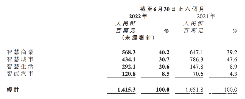與上一年同期的營收對比或許更為直觀。今年上半年,商湯智慧商業、智慧城市收入佔比分別為40.2%、30.7%,去年同期則分別為39.2%、47.6%,智慧商業和智慧城市的收入貢獻率由86.8%下降至70.9%。