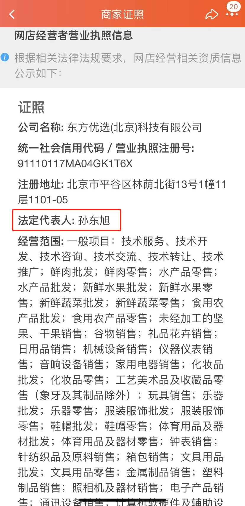 更重要的是東方甄選與淘寶直播的“曖昧信號”,東方甄選已在淘寶直播開號,直連東方甄選店鋪,上架的是東方甄選自有供應鏈產品,包括藍莓原漿、五常稻花香大米、榴蓮千層蛋糕等,還未開直播,已有月銷一兩千的成交量。該店鋪的營業執照顯示公司名稱為東方優選(北京)科技有限公司,法定代表人為孫東旭,即東方甄選CEO。