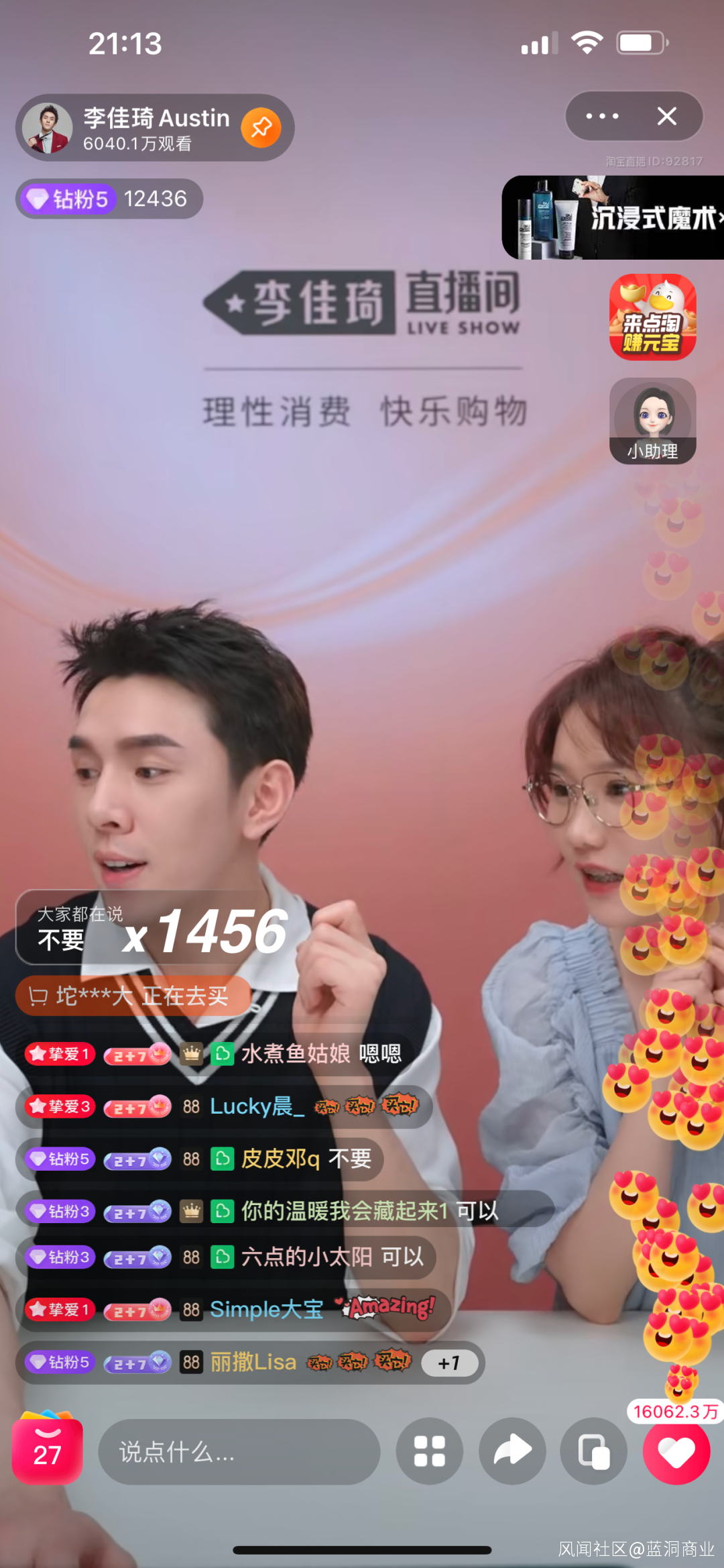 李佳琦的粉絲羣裏,粉絲紛紛表示:「老李頭低估我們對他的愛了。」「佳琦一直在説,不用因為支持李佳琦銷量就購買,但是不知道大家真的愛他,眼看着直播間人數從75萬到3000多萬。」