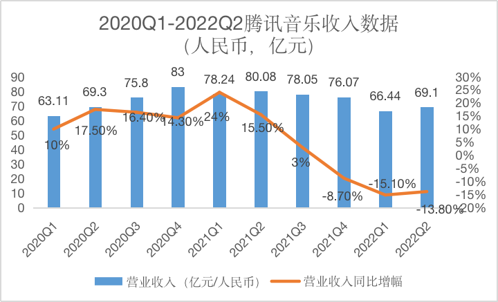 根據騰訊音樂2022年第二季度的財務數據,騰訊音樂實現營收69.1億元(人民幣),同比下降13.8%。其中,音樂服務收入為28.8億元,同比降低2.4%。社交娛樂收入為40.3億元,同比下降20.4%。