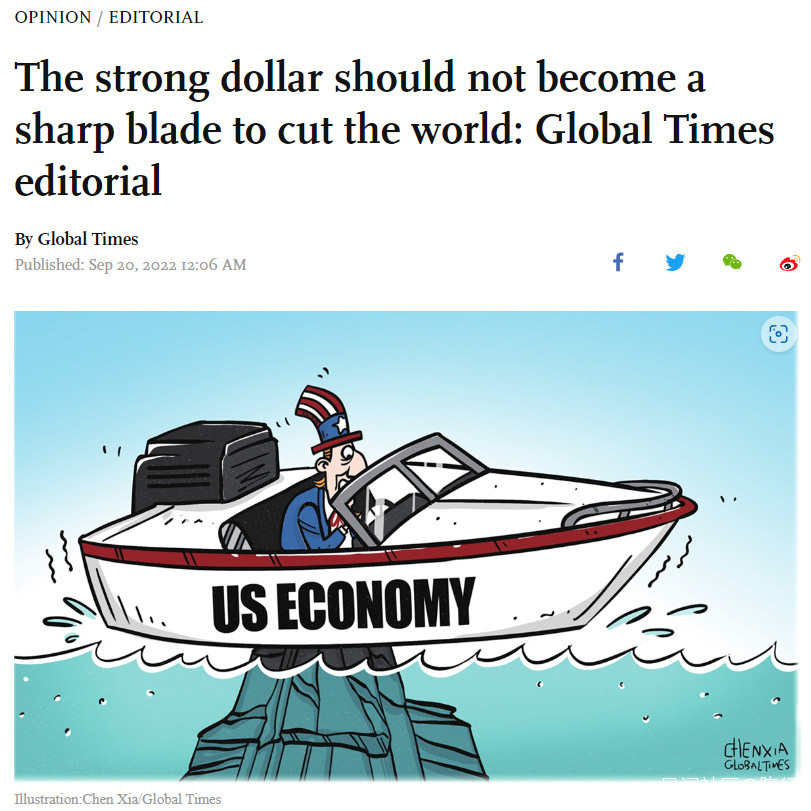1. 外媒其實越來越關注中國媒體的動向,特別是關心經濟的。昨環球時報英文版呼籲“去美元化”的文章就不錯,找對了方向。美國在那加息,很多國家受影響,怕經濟動盪出事。這其實很不正常,世界上本不應該有“美元霸權”這個東西,也可以沒有。