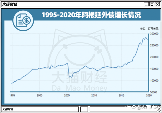 但這個政策有個前提,就是得有很多、很多錢,阿根廷祖上闊過,那時候已經不行了,他們咋辦呢?借錢搞福利,不斷靠提高赤字和借債來過日子,國家的債務額越堆越高。