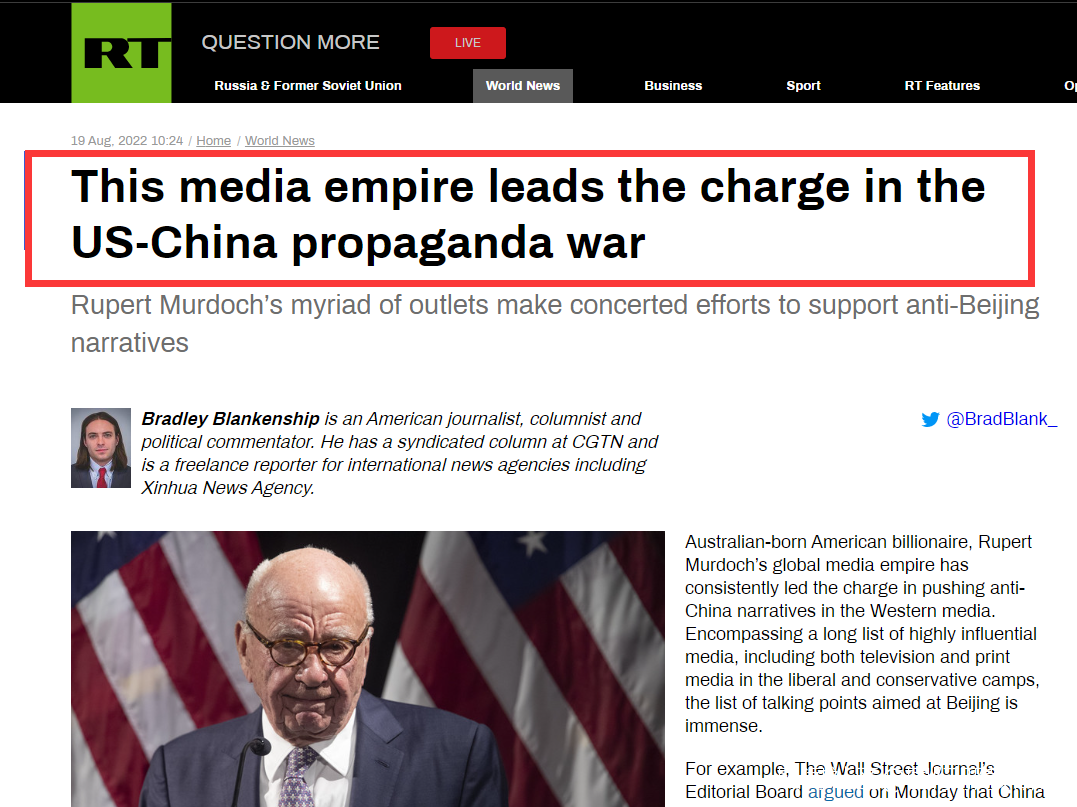 8月19日,“今日俄羅斯電視台”(RT)官方網站以《這個媒體帝國在美中媒體戰中引領反華浪潮》為題(This media empire leads the charge in the US-China propaganda war),進一步揭露了“默多克新聞集團”在西方媒體中引領反華宣傳,不惜使用炮製、捏造、歪曲等違背媒體行業操作的手段,通過虛假新聞來攻擊、抹黑中國在防疫政策、發展態勢等方面取得的突出成績。該文章認為,這些默多克媒體新聞“就是希望把中國描繪成一個險惡的實體”,文章指出這些虛假新聞報道可能會對(中國)社會造成傷害,提醒讀者在看到時要三思而後行。同時,上述“RT”主持人及官網還提及了“默多克新聞集團”旗下的“華爾街日報”華人記者範文欣、“泰晤士報”華人記者唐迪迪等人,揭露了一些出生於中國的外媒記者不遺餘力地協助西方攻擊中國政府和社會制度,為美帝國主義“助紂為虐”。