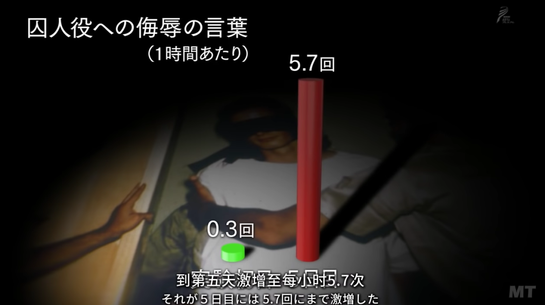 剛開始,獄卒們只是加大了對犯人們語言羞辱的力度。但五天後,他們每小時辱罵囚犯的次數,就從第一天的0.3次迅速增加到5.7次。而且犯人每十分鐘,就會被獄卒用警棍進行恐嚇羞辱。