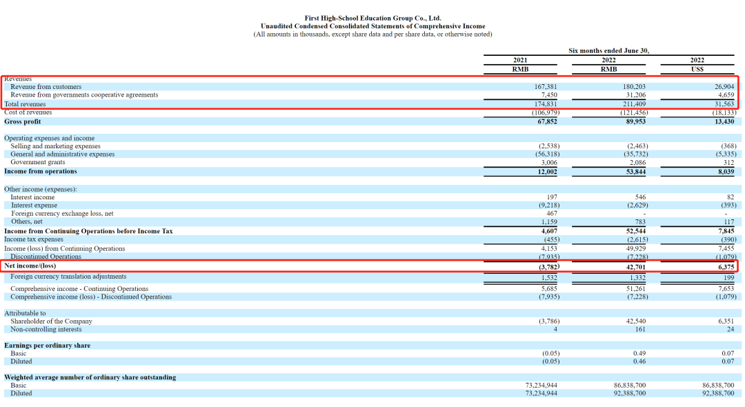 半年報中,第一高中實現了營收利潤雙增。期內總營收2.11億元,較上年同期的1.75億元增長了20.9%。