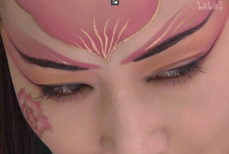 央視版的東方不敗內粉衣,外藍色紗紋上有銀色襯花,妝容上額頭間畫着粉色花瓣,眉間上翹帶着粉色的眼暈,手上用金邊勾勒牡丹花的紋路。