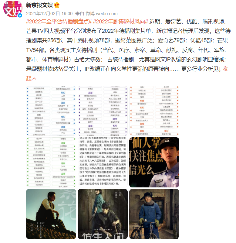 去年年底,新京報梳理了愛奇藝,芒果,優酷,騰訊四大平台待播劇,2022年共有256部。