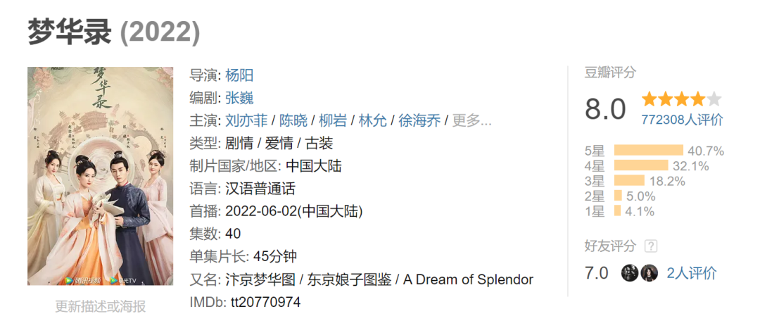 佔比還好,但看評價人數,最火的《夢華錄》比分數最高《警察榮譽》,多了整整2倍。