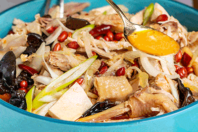 椒麻雞更像是一份涼拌菜,用多種香料炸成的油配上煮好的雞湯,再把用幹辣椒、線椒、青紅花椒等配料熬製成的椒麻汁澆在手撕的雞肉上,倒入切好的洋葱、青紅椒、木耳等配菜。