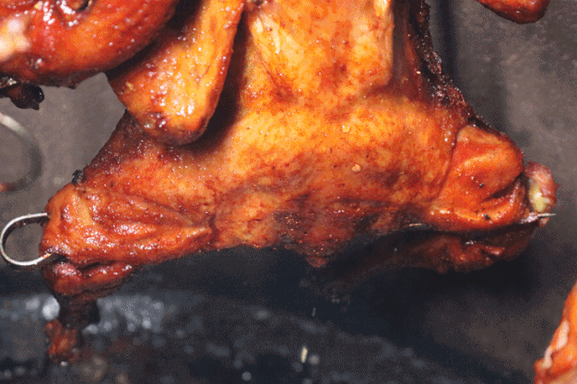經過坑裏的燻烤,雞的外皮色澤金黃、焦香四溢,撕開一小塊,裏面的雞肉汁水飽滿,雞肉的香氣混着調料的香氣,一口下去,外焦裏嫩、油潤滿足。