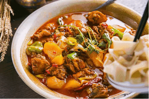 金黃的土豆有着極致的綿密口感,吸滿香料味的雞肉勁道入味,雞湯與筋道的皮帶面碰撞出極致的愉悦,有肉有菜、有湯有面,一盤即一餐。