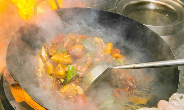 午飯時間,沙灣市一公里長的縣城主幹道上,排滿了吃雞的食客,可謂“滿城盡是大盤雞”。當地散養的土雞被“粗暴”地裝進大鐵鍋中,在大火的慫恿下被反覆翻炒。