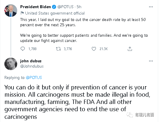 除此之外,一些網友也指出,長期看消滅癌症對人類的困擾是需要的,但現階段最需要做的是防止更多的人患上癌症,並建議拜登政府,與其推行高昂且短期很難見效的“癌症登月計劃”,不如在現階段加強對癌症的預防,降低致癌物在食品、製造、農業中的使用。
