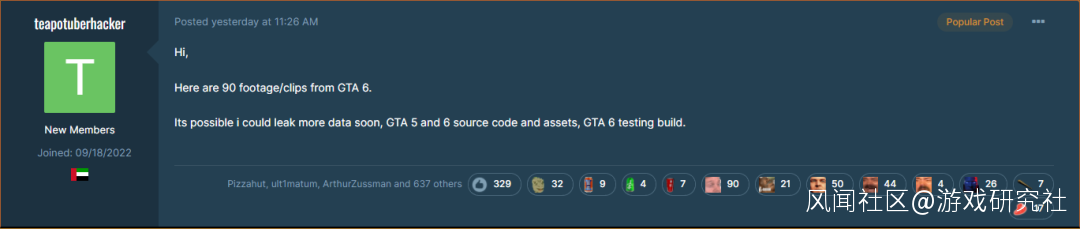 9月18日,在R星官方論壇GTAForums,一位自稱“Teapotuberhacker(茶壺,優步黑客)”的用户上傳了一個大小約3GB的壓縮包,聲稱其中總時長約50分鐘的90個視頻片段,全部來自GTA6。