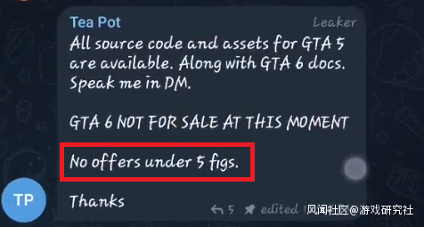 黑客表示,自己的Telegram收到了至少3000條私信。據獨立記者本(推特@videotech_)與湯姆·亨德森(Tom Henderson)調查發現,黑客暫時不打算販賣GTA6的源代碼,但仍將GTA5的源代碼和素材視作商品出售,而且“不接受低於五位數的報價”。