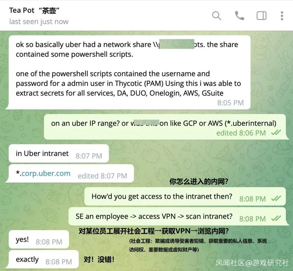 的確有一名黑客在9月15日黑進了優步公司的Slack。據《紐約時報》與《華盛頓郵報》報道,該黑客自稱“茶壺”(Tea Pot),説自己只有18歲,入侵優步只是為了“圖一樂”(for fun),現在正在考慮泄漏優步的源代碼、電子郵件和用户數據。他只是向一名自稱是IT人員的員工發了條信息,就獲得了優步系統的登陸憑據和管理員級訪問權限。