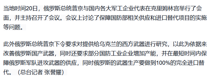 就在昨天的公開講話中,普京還在重點強調,進入動員的不僅僅是軍隊,還要包括軍工集團,要求俄羅斯未來生產的武器一定要達到100%的國產化。事實上,普京對於俄羅斯國產武器的性能一清二楚,就連他親自視察的軍車都能把門把手拽掉,更別説其他裝備了。