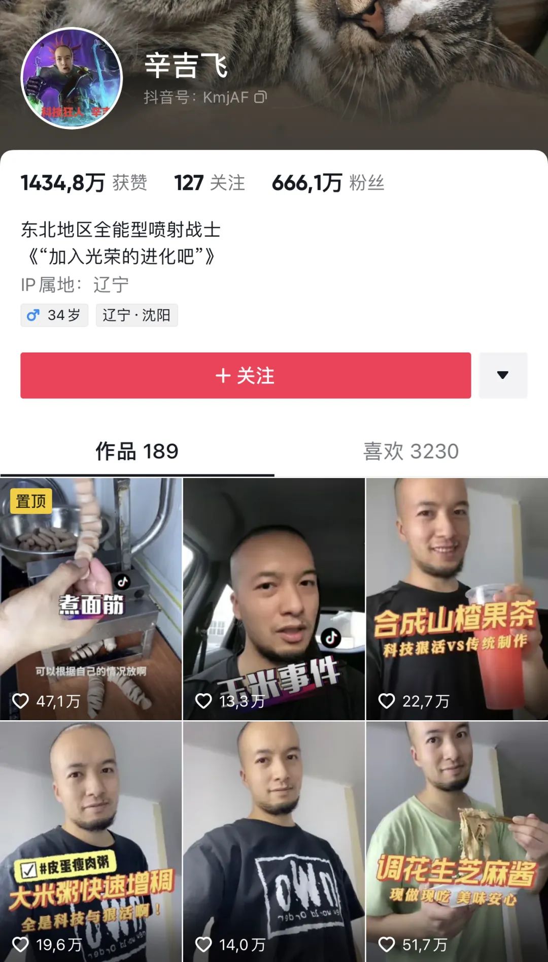 抖音達人“辛吉飛”,本是眾多普通抖音用户中的一員,在爆火之前,辛吉飛已經在抖音斷斷續續地更新了三年多,視頻內容與他“食品人”的身份也頗為相符,不是拍攝一些美食,就是做一些簡單的美食教學。