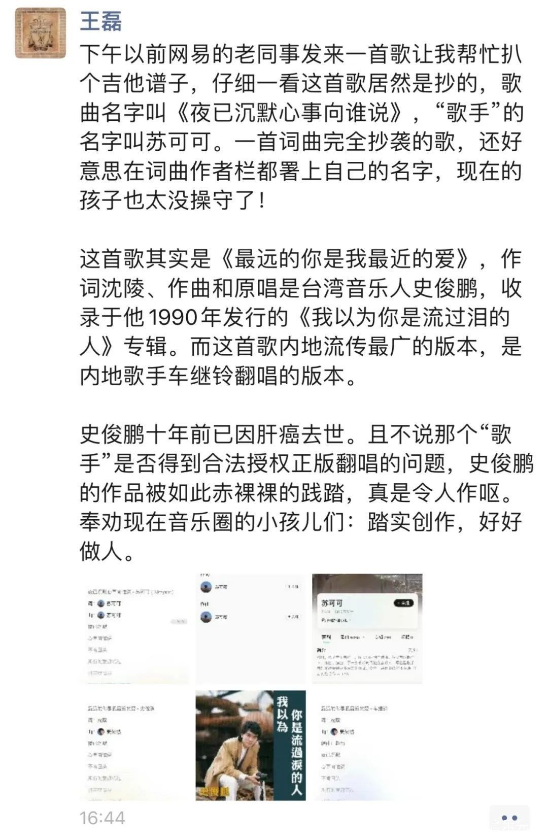 今天下午,資深樂評人王磊老師在朋友圈吐槽了一位抄襲音樂人“蘇可可”。