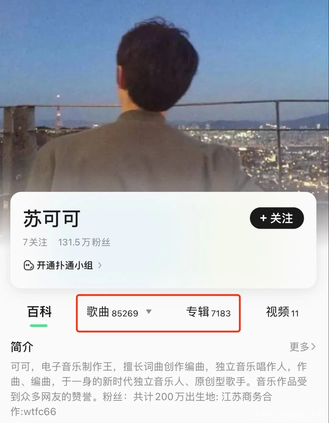 點開“蘇可可”的音樂人頁面,這位自詡作曲、編曲於一身的新時代獨立音樂人、原創型歌手,年紀輕輕就發了7183張專輯、85269首歌,其中7月就發了41張專輯,恐怕羅大佑、李宗盛都難望其項背。