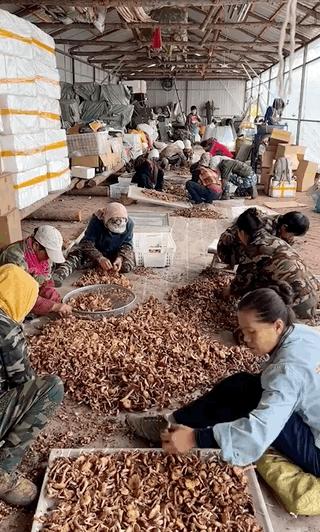 在劉佳寧的倉庫中,有許多當地人幫着挑揀蘑菇、清洗藥材和打包貨物,然後從劉佳寧的手中,獲得一份收入。
