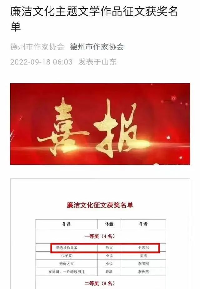 9月18日,德州市作家協會發布“廉潔文化主題文學作品徵文獲獎名單”,其中《我的縣長父親》一文獲得徵文比賽一等獎。
