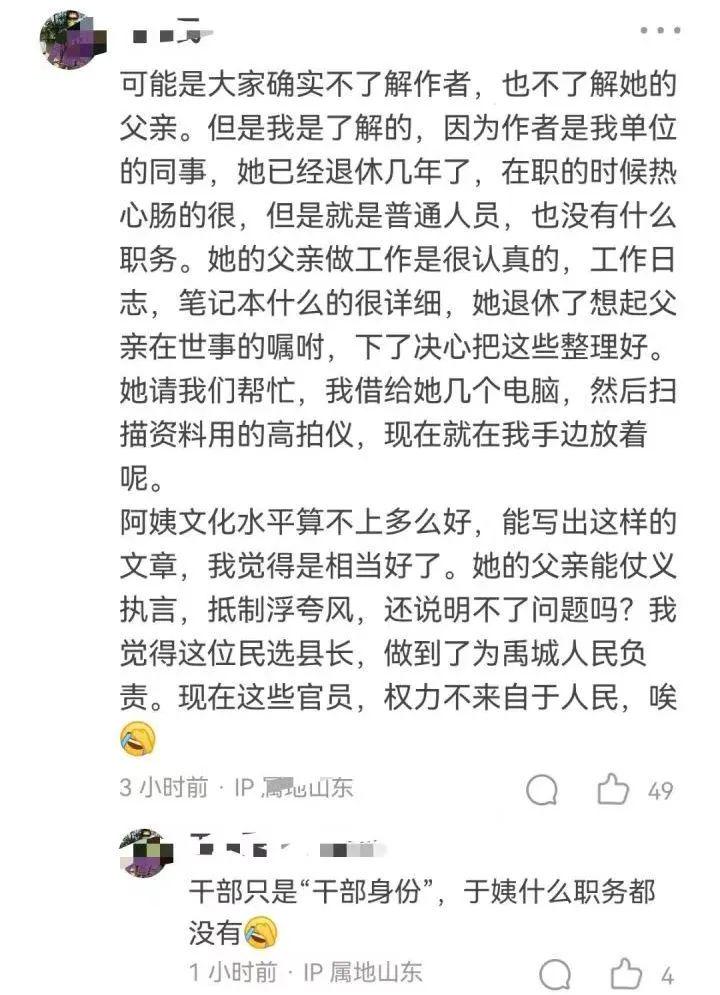文章作者於忠東是一名已經退休了幾年的女性,“縣長父親”叫於志明,是山東省禹城縣第一任縣長。