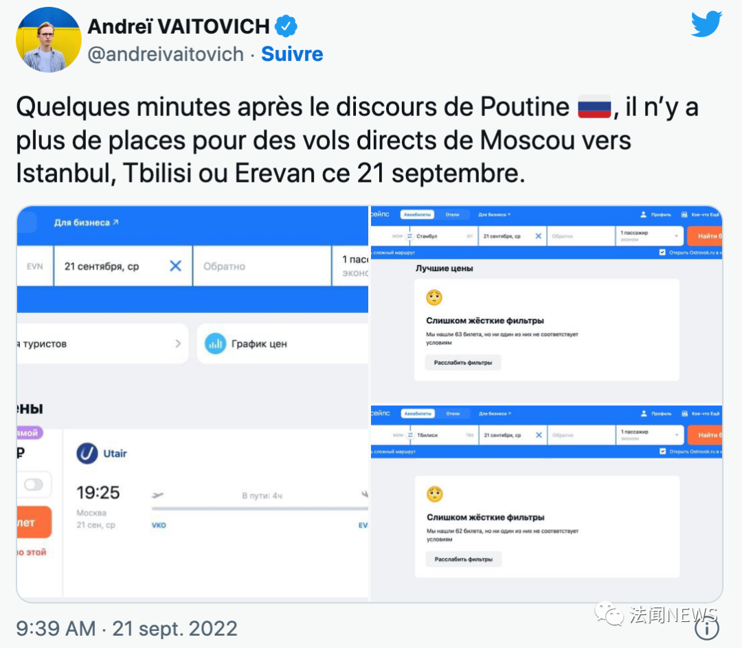 9月21日當天從莫斯科到鄰國格魯吉亞、土耳其和亞美尼亞首都的航班在幾分鐘內就售罄。到中午,從莫斯科直飛阿塞拜疆、哈薩克斯坦、烏茲別克斯坦和吉爾吉斯斯坦的航班也已預訂一空。甚至據法新社報道,塞爾維亞航空公司莫斯科-貝爾格萊德航線,下一個有空位的航班最早已經是9月26日下週一。