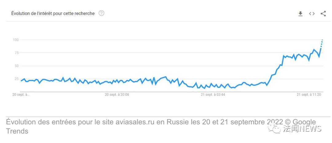 離開俄羅斯的機票購買量急劇增加,航班預訂網站Liligo表示,從週二開始到今天,俄羅斯出發的機票搜索量增加了2.5倍,週三繼續上升。谷歌數據也顯示,從週三早上8點普京講話開始,“機票”,“航班”兩個詞的搜索量增加了一倍以上,“如何離開俄羅斯”的搜索量也出現了高峯。
