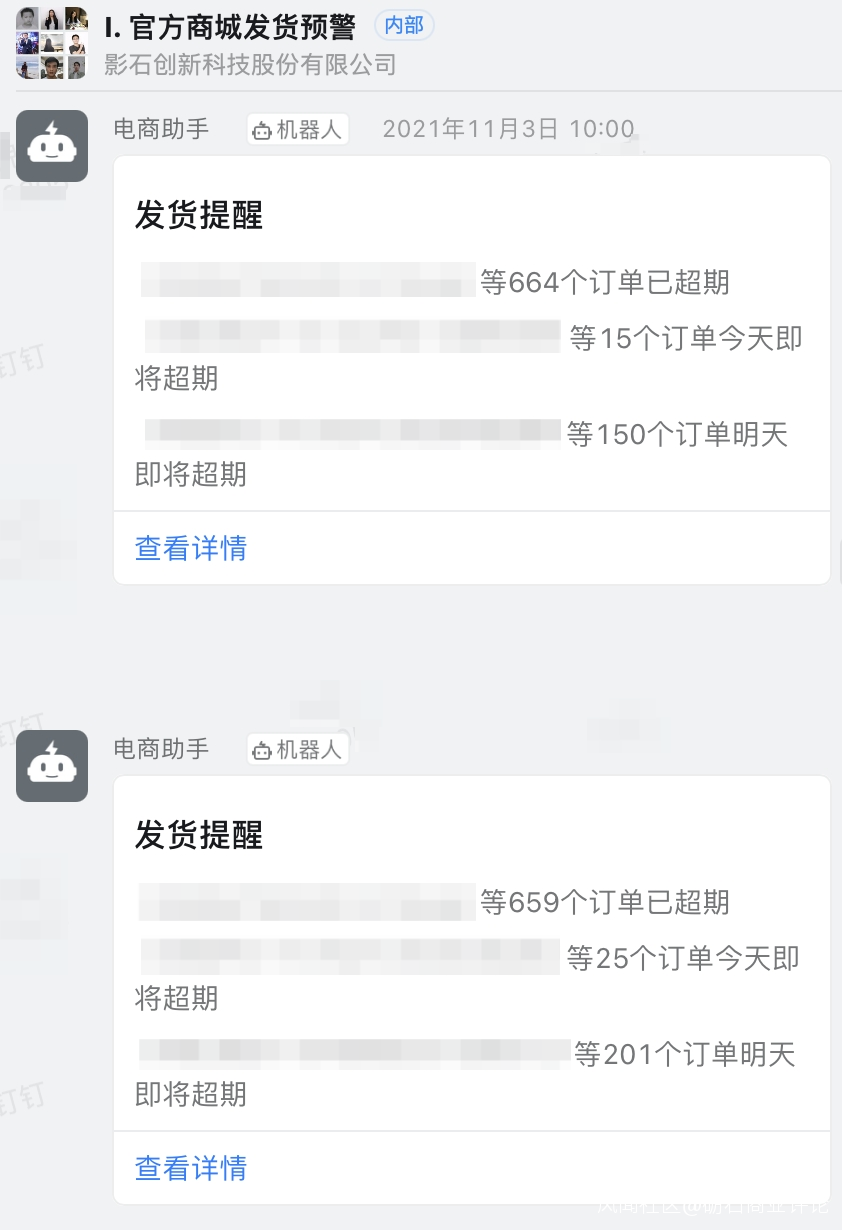 遇到雙十一等大促節點,往往會湧進大量訂單,而不同平台有不同的發貨規則和時間節點。過去,全靠人力調度,每天倉庫主管需要在店鋪盯着後台檢查是否有發貨堆積。之後,影石IT主管將釘釘機器人和影石自建商城的運營後台打通,一旦出現發貨延遲,便會第一時間在釘釘羣裏發出“發貨堆積”預警,並推送至打包人員,避免訂單違約。節省人力的同時,也提高了客户對於物流的滿意度。