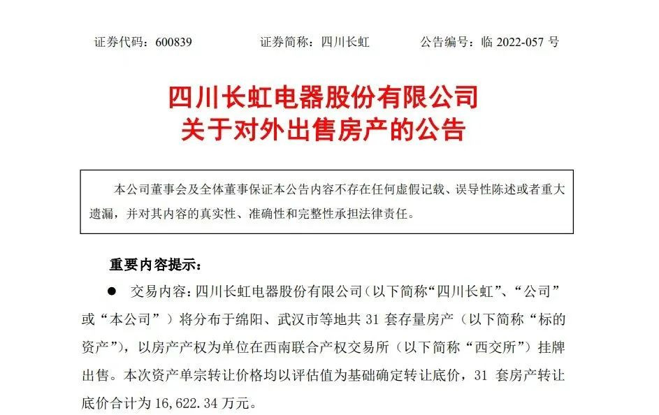 惡性循環並沒有停止。2022年8月24日晚,四川長虹發佈公告稱,為盤活存量資產,公司綿陽、武漢市等地共31套存量房產,在西交所掛牌出售,31套房產轉讓底價共計1.66億元。