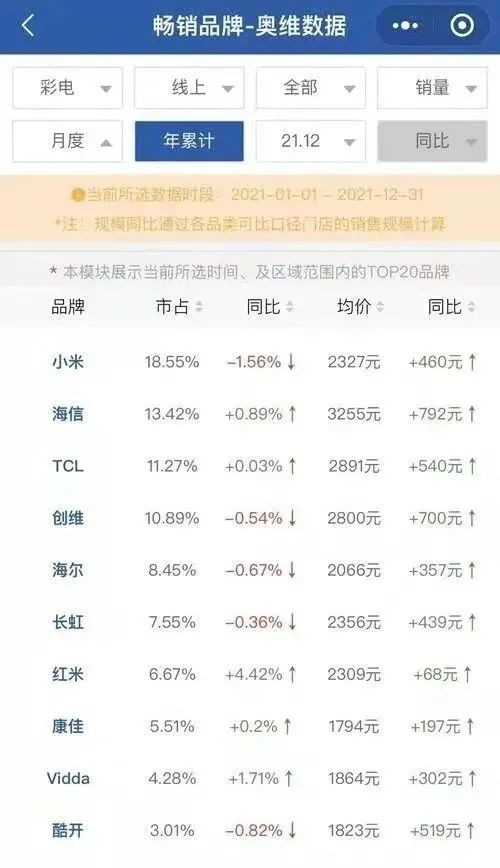 據奧維雲網發佈的2021年中國彩電銷量排行榜顯示,四川長虹排名第6,市佔率僅為7.55%,直接滑出第一梯隊,與競爭對手之間的差距也在不斷加大。