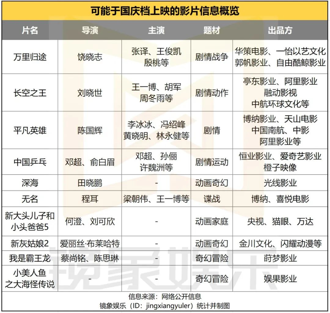 由於遲遲未有影片定檔,當前可能會在國慶檔上映的影片,多為市場根據影片宣傳動作的一種普遍猜測,但在有限的檔期承載力下,6部大體量影片大概率不會扎堆定檔。