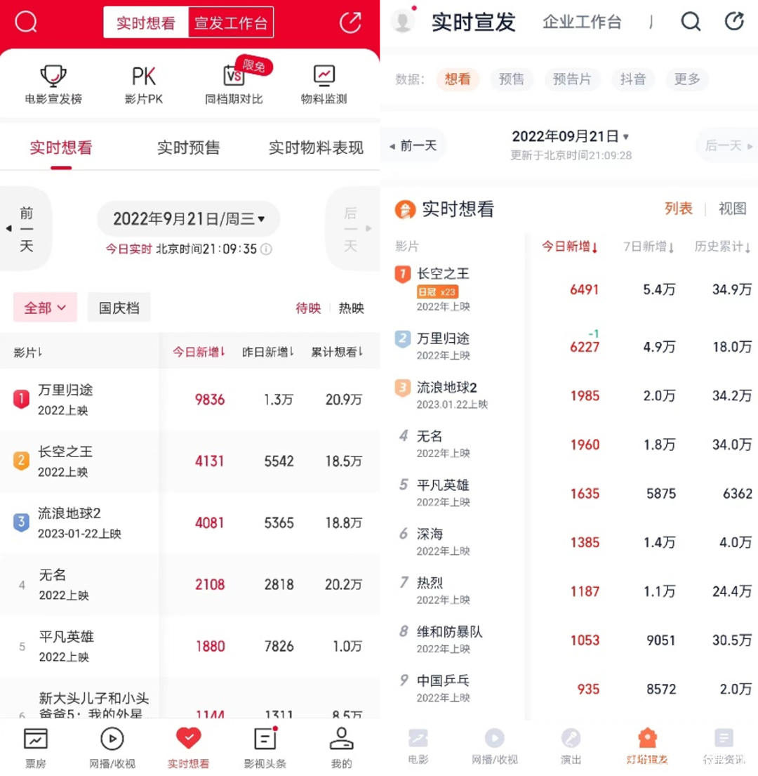 然而,進入9月上旬,《深海》《中國乒乓》逐漸停止了宣發動作,同期的《無名》也在釋出一支全新預告片之後,至今沒有新的物料釋出。相比之下,《萬里歸途》《長空之王》仍在有節奏地釋出物料信息,貓眼和燈塔數據中,兩部影片的新增想看人數都位列前兩位,累計想看人數中,兩部影片的數據也相對靠前。