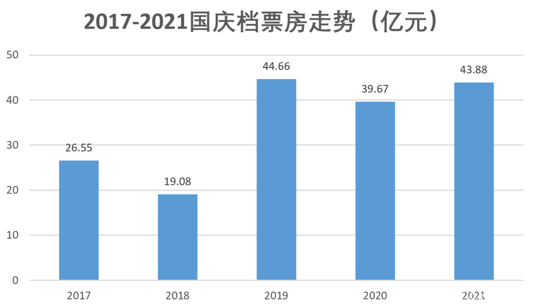 從以往的國慶檔票房走勢來看,貓眼數據顯示,2017年至2021年,國慶檔票房整體具有一定波動性,近三年內則相對穩定在40億左右的量級,手握重磅影片的公司大多對這一票倉虎視眈眈。