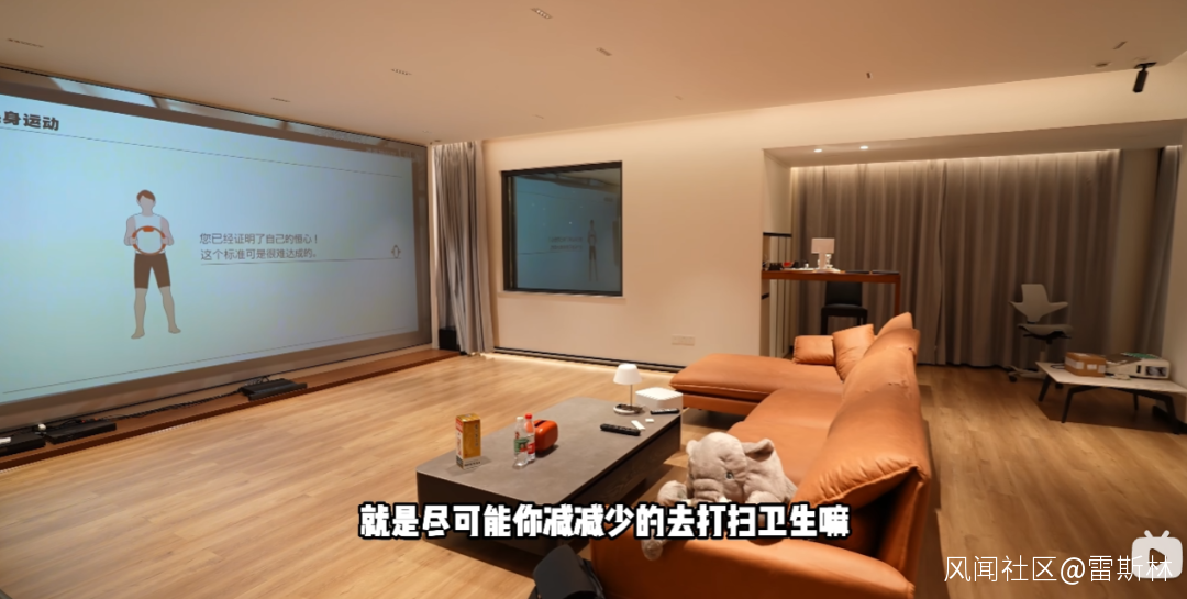 他們家從外面看起來沒那麼豪華,也沒有什麼江景啥的,但是家裏裝了個200寸的激光投影幕布: