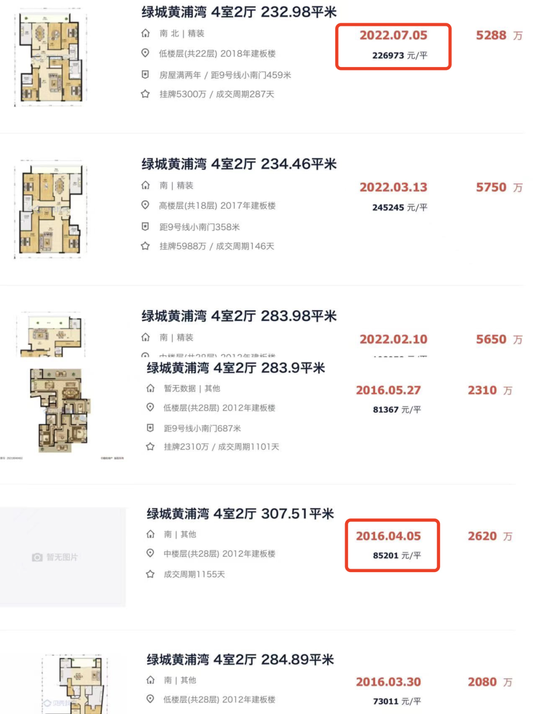 綠城黃浦灣今年7月的低樓層成交單價超過22萬元/平方米,而2020年成交的一套單價約13.7萬元/平方米。