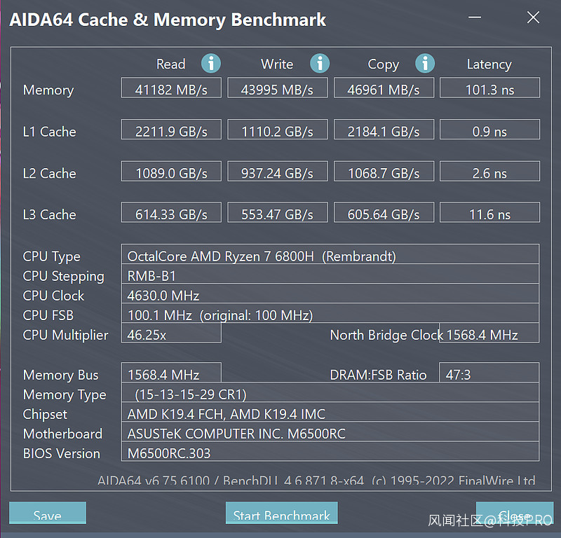內存實測,16GB 5500MHz LPDDR5雙通道板載內存讀取速度為41182MB/s,寫入速度為43995MB/s,複製速度為46961MB/s,時延101.3ns。與時俱進的迭代,確保了它的水平在平均值之上。