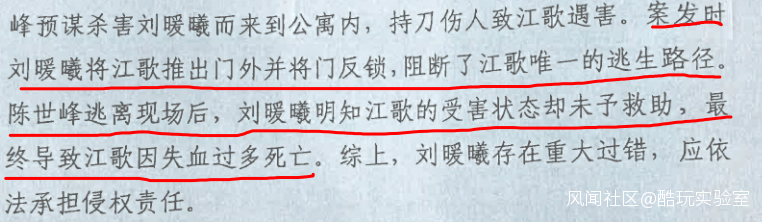 這個案發描述,明白無誤地指出是劉鑫把江歌推出門外並把門反鎖,同時在陳世峯逃離現場後,劉鑫明知江歌的受害狀態也未予救助,導致江歌因失血過多而亡。