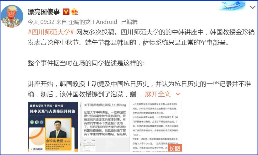 近日,四川師範大學的中韓講座中,韓國教授金XX發表言論稱中秋節、端午節都是韓國的,薩德系統只是正常的軍事部署,引發在校學生不滿。
