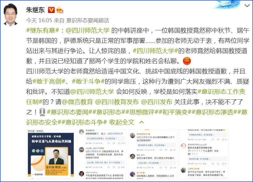 四川師範大學的老師竟然給造謠中國文化、挑戰中國底線的韓國教授道歉,並且給#敢於亮劍#、#敢於鬥爭#的同學施壓,這種行為遭到廣大網友強烈不滿、質疑和批評。不知道@四川師範大學 會如何反映,學校是如何落實#意識形態工作責任制#的?請@微言教育 @四川教育發佈 @四川發佈 關注此事,決不能不了了之!