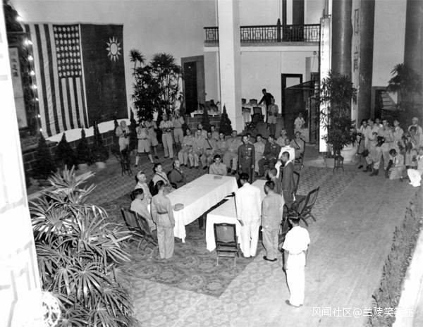 1945年8月21日,湖南芷江,中國受降代表陸軍參謀長蕭毅肅向日軍投降代表今井武夫等訓話。