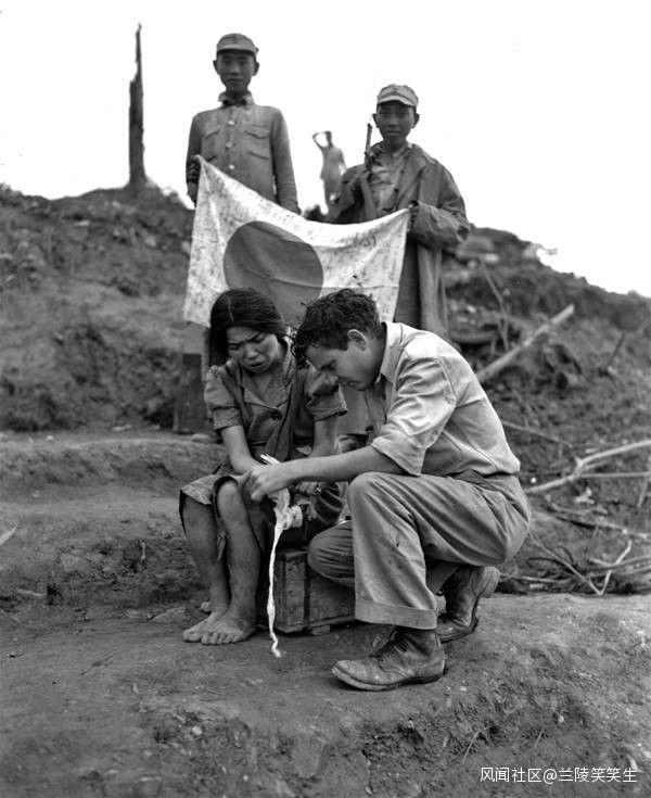 1944年9月7日,雲南龍陵縣臘勐鄉松山,一名美軍士兵在給被俘虜的日本女子包紮,背後的兩名中國士兵在展示他們繳獲的日本軍旗。