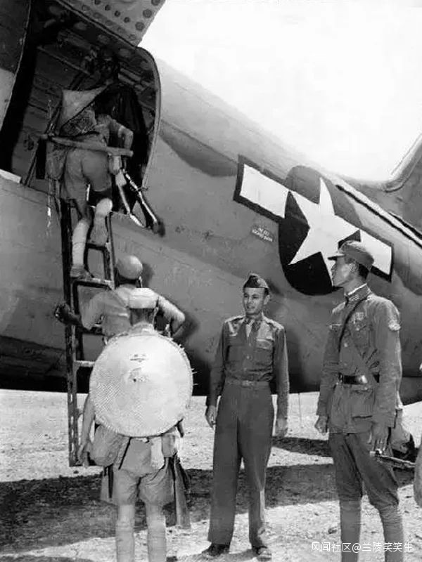 1944年9月6日,威廉·H·皮克斯上校和少霖(音譯上尉,一起目送中國第五陸軍士兵登上昆明機場的飛機。