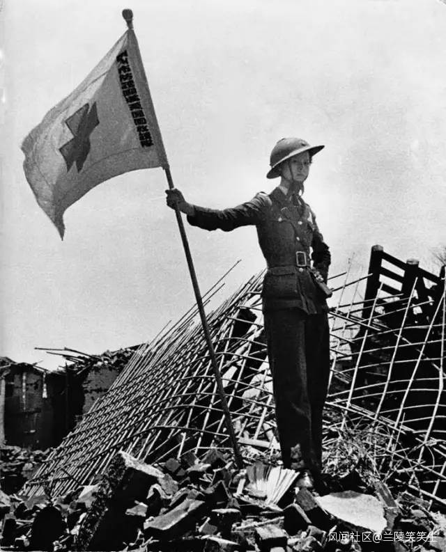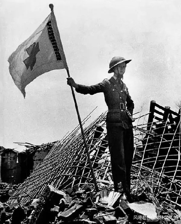 1944年左右,這位緊急救護隊的女學生在被炸燬的房屋廢墟上,豎起了紅十字會的標準 旗幟。