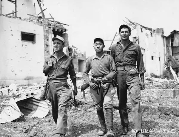 1945年3月15日,華盛頓的傑拉爾德·克瑞甘上尉以及弗吉尼亞州的霍華德·格里高裏上尉,與他們的中國朋友正一起從緬甸臘戍的廢墟走出來。美軍通信兵Signal Corps/攝。
