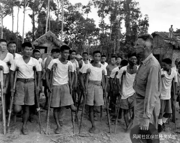 1944年7月15日,在沿列多公路某處的康復營地裏,史迪威將軍脱帽對着一羣中國退伍軍人講話。